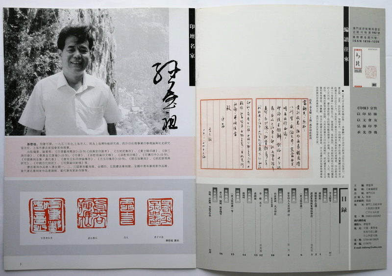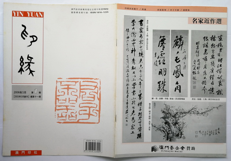 《印缘》2006年第1期,总第11期,2006年3月出版。澳门印社出版,陆康任社长,廖富翔主编。 本期主题介绍孙慰祖,刊登孙洵撰《东皋印人人名印谱序》,另推介黄文宽、裘国强、蒋瑾琦、矫健、廖富祥等作品。