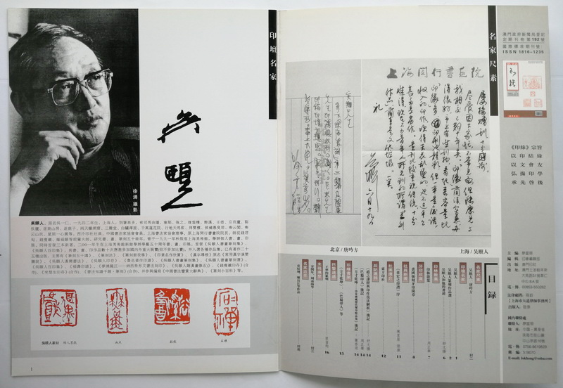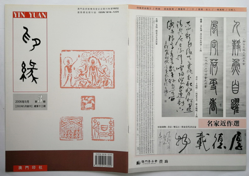 《印缘》2006年第3期,总第13期,2006年9月出版。澳门印社出版,陆康任社长,廖富翔主编。本期主题介绍吴颐人,含个人简介、篆刻作品及舒文扬文章。刊登陈茗屋、陆康撰《董宏之印谱序》,及周正举、萧春源、廖富祥等文章,另推介裘国强牙印。