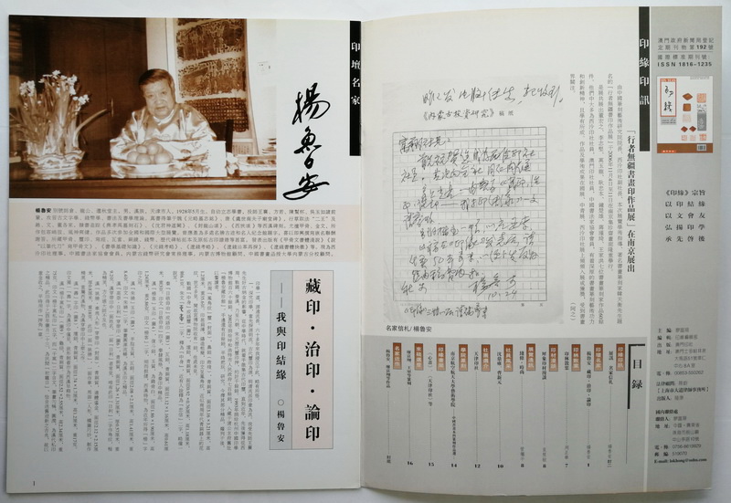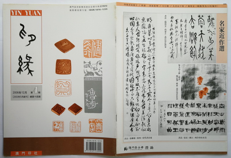 《印缘》2006年第4期,总第14期,2006年12月出版。澳门印社出版,陆康任社长,廖富翔主编。本期主题介绍杨鲁安的藏印、治印、论印,刊登周正举、袁慧敏、管继平文章,推介天津印社、南京航空航天大学艺术学院以及沈鼎雍、曹新元等作品。