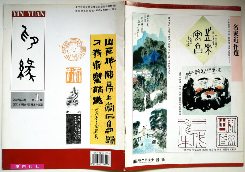 《印缘》2007年第1期,总第15期,2007年3月出版。澳门印社出版,陆康任社长,廖富翔主编。 本期主题介绍骆芃芃, 刊登童衍方文章,介绍《陈身道篆刻》,另登载《陆康书瓷板陶壶竹木联乌檀木镇尺作品选》。