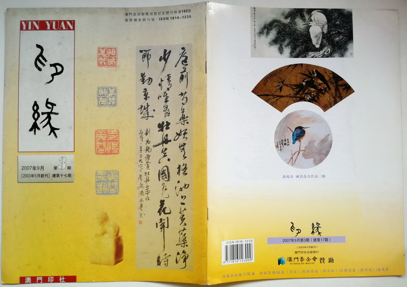 《印缘》2007年第3期,总第17期,2007年9月出版。澳门印社出版,陆康任社长,廖富翔主编。 本期主题介绍汤兆基, 含韩天衡、顾行伟文章。刊登周正举、杨忠明文章,社员风采介绍崎岖、唐和臻,登载陆康刻心经以及刘江、刘一闻等作品。