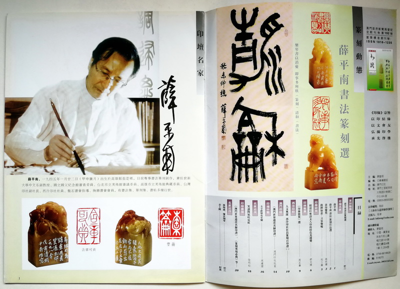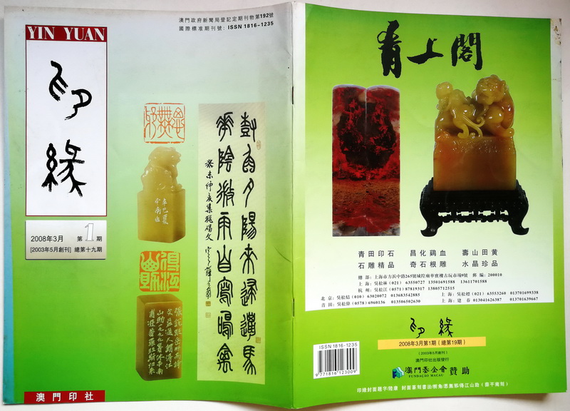 《印缘》2008年第1期,总第19期,2008年3月出版。澳门印社出版,陆康任社长,廖富翔主编。 本期主题介绍薛平南,含蔡明赞、杜三鑫文章。刊登舒文扬、周正举、周建国文章,以及徐明松撰《笑谈间气吐霓虹——海归篆刻名家陆康》。又登载澳门印社策划之《澳门世界遗产名录印谱》 ,何厚铧题词。