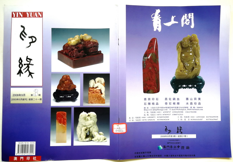 《印缘》2008年第3期,总第21期,2008年9月出版。澳门印社出版,陆康任社长、发行人,廖富翔主编。 本期主题介绍“金石永寿——中国寿山石篆刻艺术展”。刊登孙慰祖《印中岁月——可斋忆事印记》选刊、邓丁撰《印中岁月》序、《陆康吉印祥语》印选以及周正举文章、茅大为篆刻等。