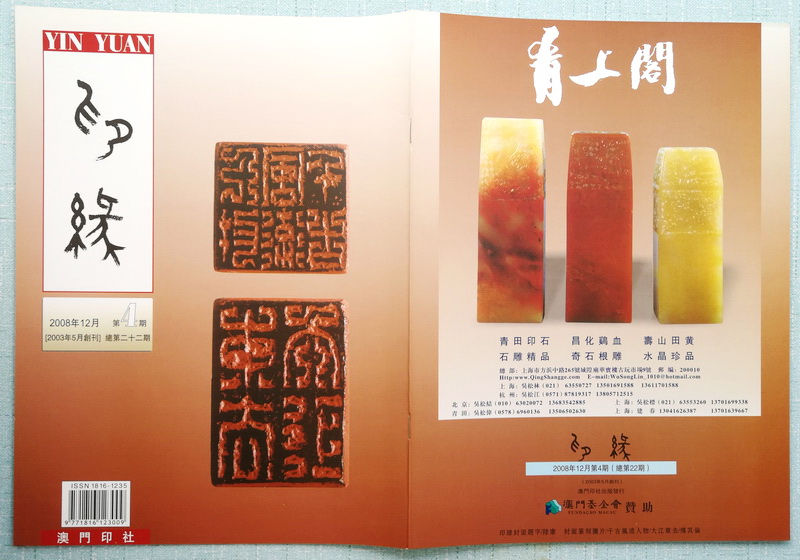 《印缘》2008年第4期,总第22期,2008年12月出版。澳门印社出版,陆康任社长,廖富翔主编。本期主题介绍傅其伦,含张郁明、刘一闻、唐吟方、胡小罕等评介。 另载袁慧敏谈林清卿薄意、舒文扬谈个人篆刻、钱君匋谈吴天祥篆刻、廖富祥谈姜山图文印等文章,展示黄教奇、曾子龙、宋哲金等作品,封二登王佩智、孙慰祖来信。