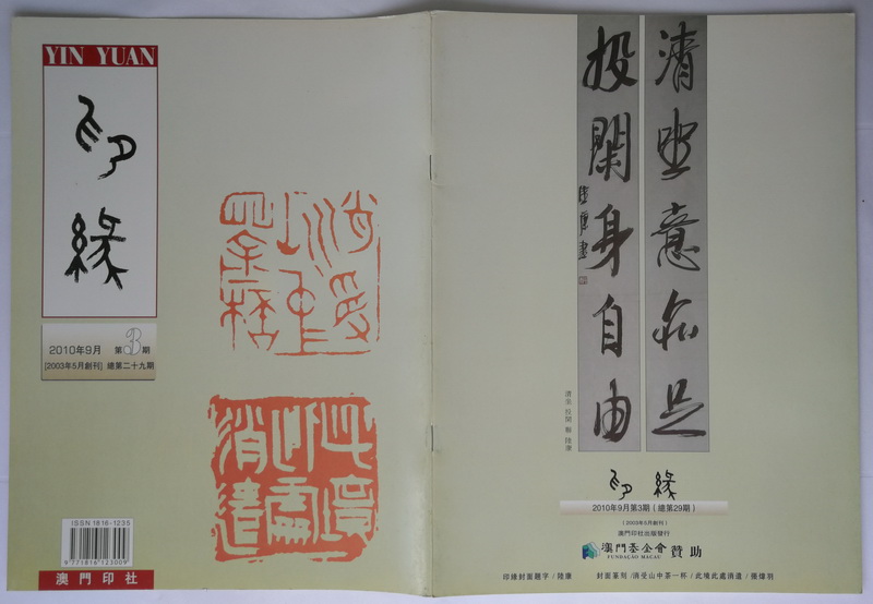 《印缘》2010年第3期,总第29期,2010年9月出版。澳门印社出版,陆康任社长,廖富翔主编。本期 封面人物张炜羽,收入牛泽甫、向黄、周正元、夏法起等作品,登载孙慰祖、舒文扬撰《他悄悄地艺术着——关于夏法起的画印与印雕》。