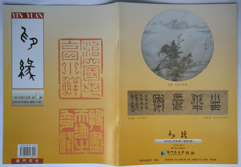 《印缘》2010年第4期,总第30期,2010年12月出版。澳门印社出版,陆康任社长,廖富翔主编。本期 封面人物张遴骏,刊登陆康新作,介绍徐国强、李志坚篆刻,收入刘云鹤撰《我与沙曼翁先生的书印缘》。