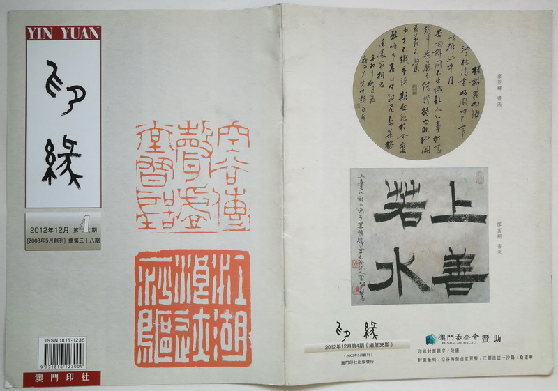 《印缘》2012年第4期,总第38期,2012年12月出版。澳门印社出版,陆康任社长,廖富翔主编。本期主题介绍 桑建华,刊登云南省首届篆刻艺术展作品选以及谢国铭、刘衡、曾子龙、赵汉萍、林国生、廖亚辉、廖富翔等作品。