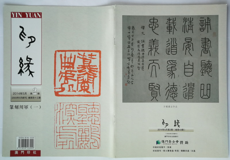 《印缘》2014年第2期,总第43期,2014年5月出版。澳门印社出版,陆康任社长,廖富翔主编。本期 为“篆刻川军”专题,刊登郭强撰《“印”证天府,“章”扬巴蜀》,登载郭强、唐德明、缪永舒、汪黎特、方晓、刘征兵、向黄、潘锡仁、刘健、邓长春、周正元、田磊、黄博等作品。