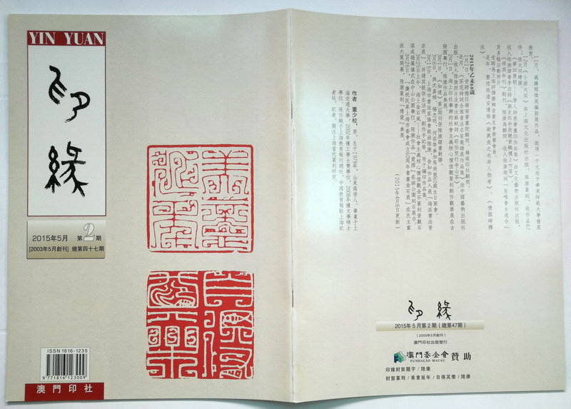 《印缘》2015年第2期,总第47期,2015年5月出版。澳门印社出版,陆康任社长,廖富翔主编。本期为陆康艺术年表专辑,董少校撰,含陆康篆刻多件。