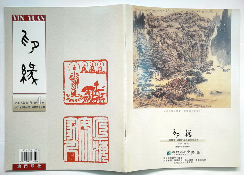 《印缘》2015年第4期,总第49期,2015年10月出版。澳门印社出版,陆康任社长,廖富翔主编。本期 介绍赵叔孺、陈巨来、陆康、西墙、陈道明、陶波、田瑞果、王鹏、龚国芝、黄海山、刘衡、刘平之、廖富翔、林国生等艺术。部分艺术家系赵叔孺门下弟子及再传弟子。