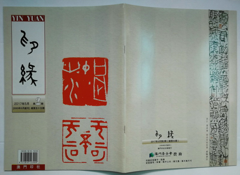 《印缘》2017年第2期,总第55期,2017年5月出版。澳门印社出版,陆康任社长,廖富翔主编。本期 专题推介东吴印社,刊登董少校关于陈茗屋散文的评论,另有徐才友、曹恒泰、傅其伦等专题报道展示。