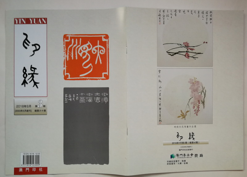 《印缘》2018年第1期,总第60期,2018年9月出版。澳门印社出版,陆康任社长,廖富翔主编。本期专题推介岳峰书法篆刻, 介绍简斋工作室,并刊登杨祖柏、胡层华、戴安然、闵青、顾翔、徐静、孙凤庭篆刻。另外推介赵杰篆刻、时钧夫花鸟画。