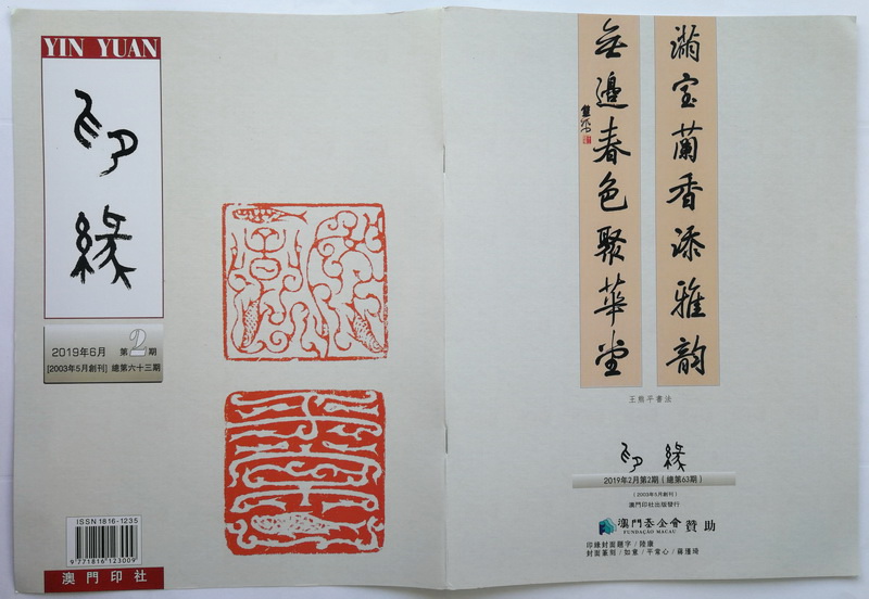 《印缘》2019年第2期,总第63期,2019年6月出版。澳门印社出版,陆康任社长,廖富翔主编。本期主题介绍蒋瑾琦,含其书法篆刻及相关评论。“篆刻观察”栏目刊登董少校撰《听陆康讲故事》及《徐庆华在高东樱花节现场创作巨幅草书》,另载廖亚辉、王熊平作品及评论。