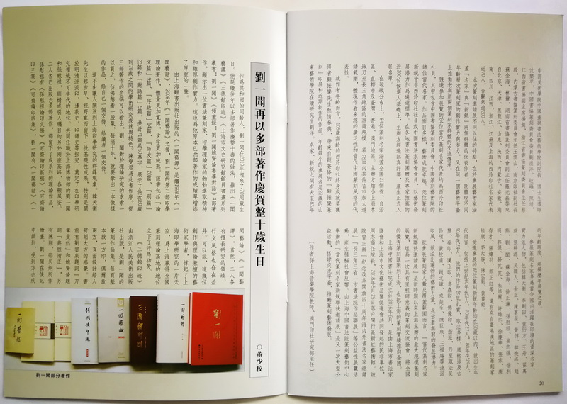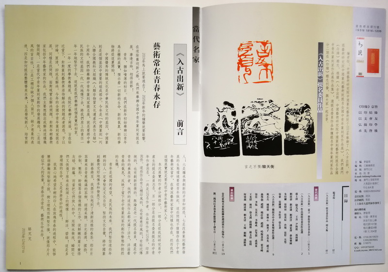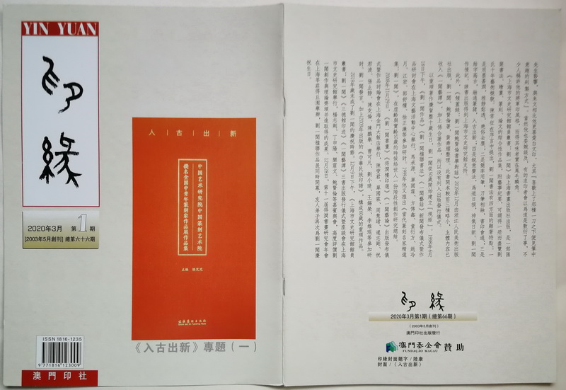 《印缘》2020年第1期 《印缘》2020年第1期,总第66期,2020年3月出版。澳门印社出版,陆康任社长,廖富翔主编。本期主题介绍“入古出新”中国艺术研究院中国篆刻艺术院提名全国中青年篆刻家作品展,含 骆芃芃序言《艺术常在,青春永存》,以及韩天衡、王丹、朱培尔、谷松章、林墨子、叶青峰等作品。“篆刻观察”栏目登载董少校撰《当代篆刻名家新锐联袂邀请展在上海举行》和《刘一闻再以多部著作庆贺整十岁生日》。